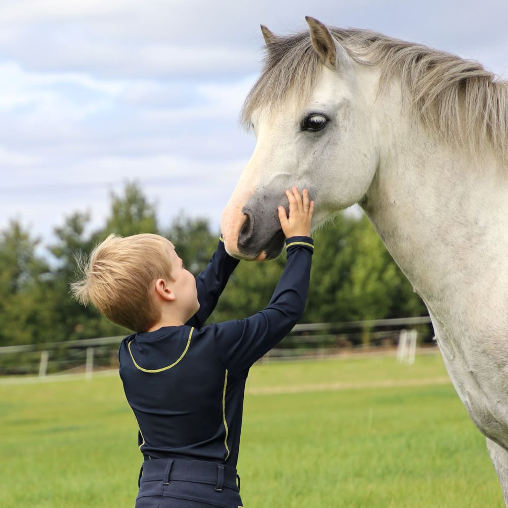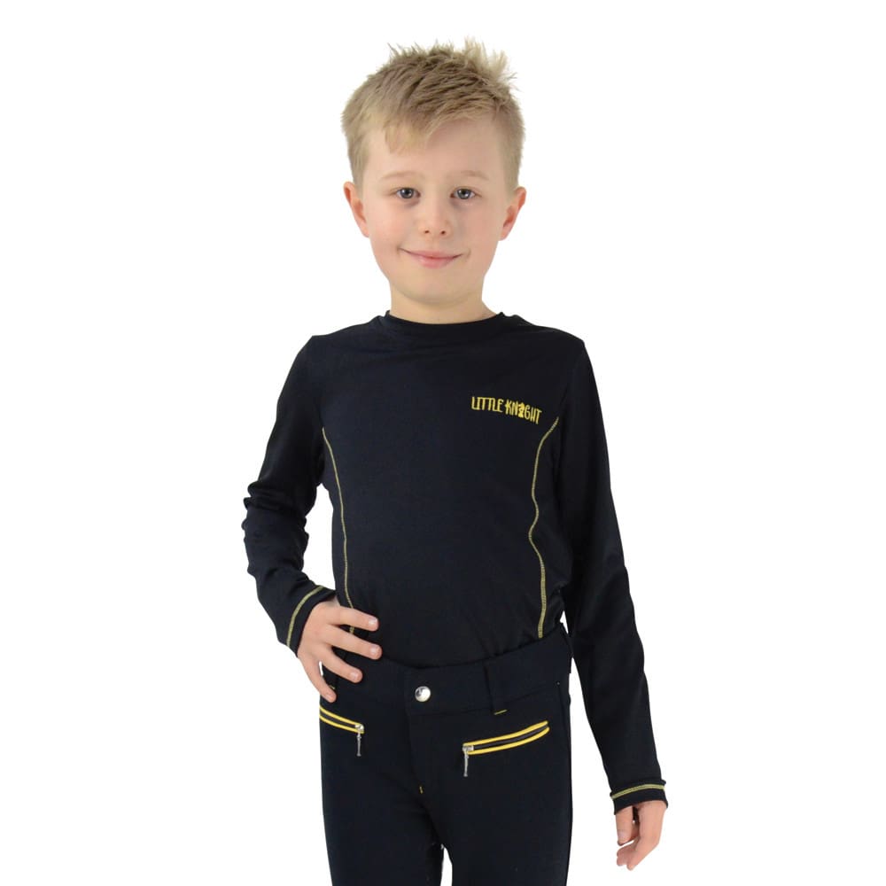 Perfect for an active child who loves being outdoors. In a breathable four way stretch navy blue fabric, this practical top is designed to keep your child feeling comfortable. Featuring the Little Knight legend on the chest and contrasting yellow topstitc